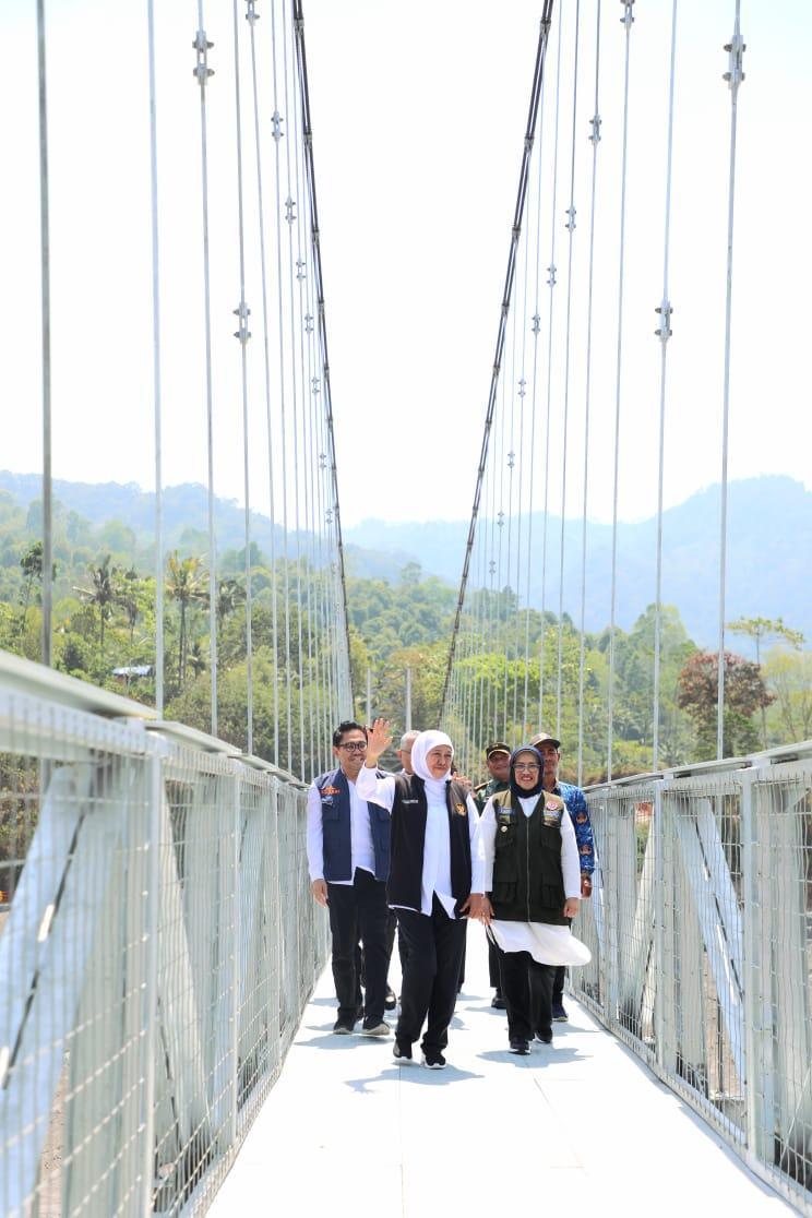 Gubernur Jatim Khofifah meresmikan Jembatan Gantung Kaliregoyo di Desa Sumberwuluh, Kecamatan Candipuro, Tanggul Sungai Glidik dan Mujur Kab. Lumajang, Selasa (17/10/2023).