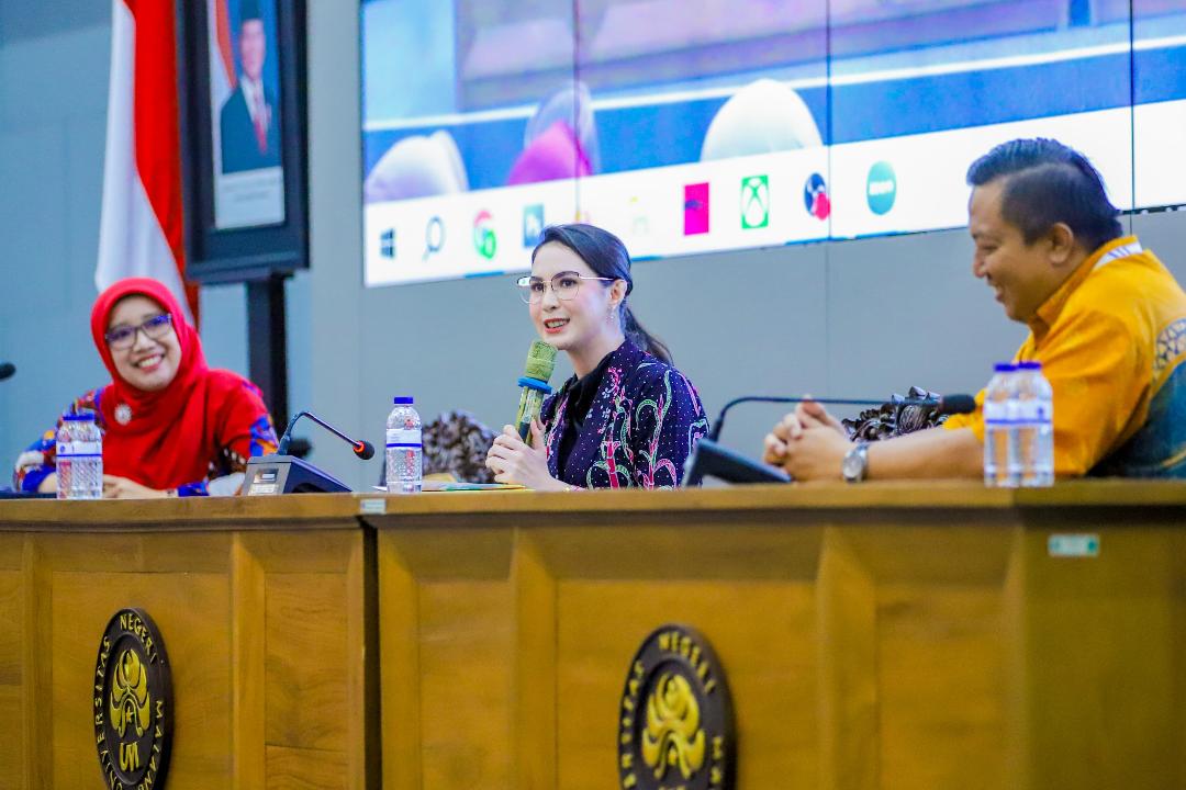 Ketua TP PKK Provinsi Jatim Arumi Bachsin Emil Dardak (tengah) saat menjadi pembicara dalam Seminar Nasional Pendidikan Anak Usia Dini (PAUD) Tahun 2025 di Universitas Negeri Malang, Kota Malang, Kamis (8/5/2025).