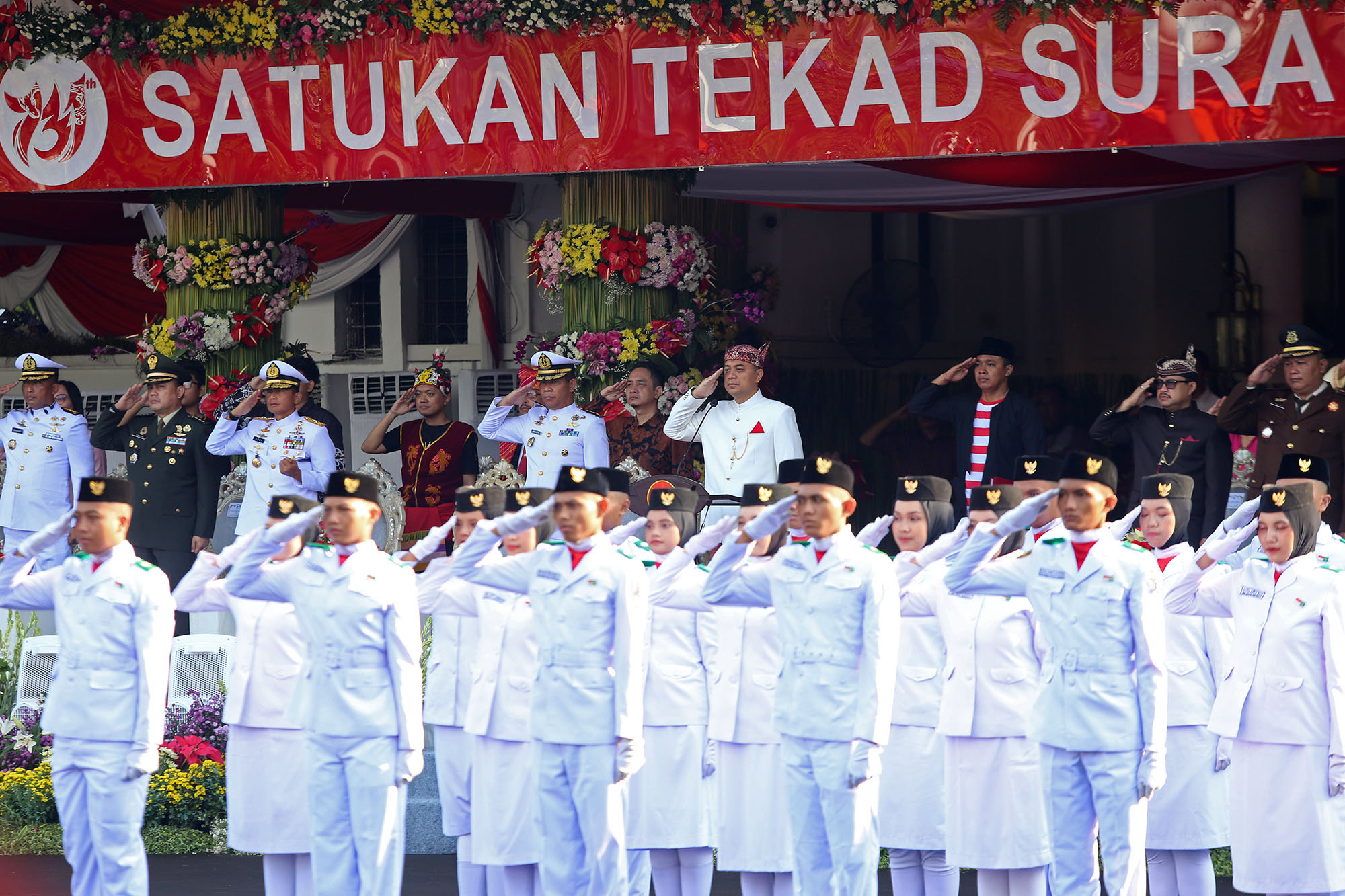 Surabaya (mediakorannusantara.com) – Pemerintah Kota (Pemkot) Surabaya menggelar upacara peringatan Hari Lahir Pancasila di Halaman Balai Kota Surabaya, Sabtu (1/6/2024). Peringatan Hari Lahir Pancasila 2024 mengusung tema ‘Pancasila Jiwa Pemersatu Bangsa Menuju Indonesia Emas 2045’. Pada kesempatan tersebut Wali Kota Surabaya Eri Cahyadi bertindak sebagai inspektur upacara.